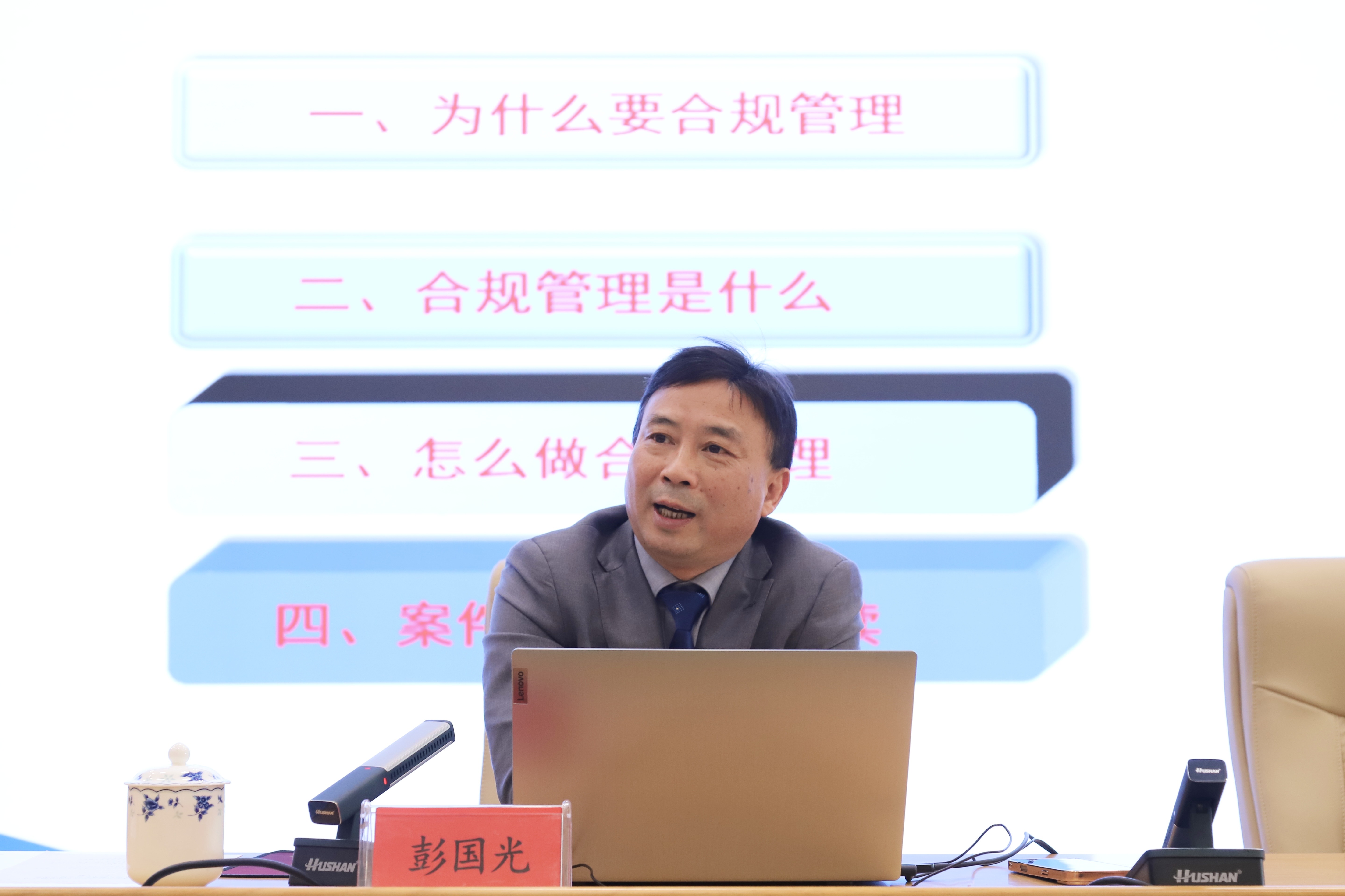 本次培训特邀岳阳市政协委员、湖南碧灏律师事务所高级合伙人彭国光担任主讲嘉宾。培训以“依法治企 合规先行”为主题,围绕“为什么要合规管理”“合规管理是什么”“怎么做合规管理”及“案件管理办法解读”四大核心板块展开深入讲解,系统阐释了合规管理和法律纠纷处置的核心内涵和实践要求,培训内容详实、逻辑清晰、指导性强,为全体参训人员带来了一堂精彩授课。